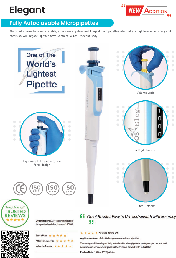 - Pipette Abdos Elegant có thiết kế siêu nhẹ, công thái học, lực pipette thấp